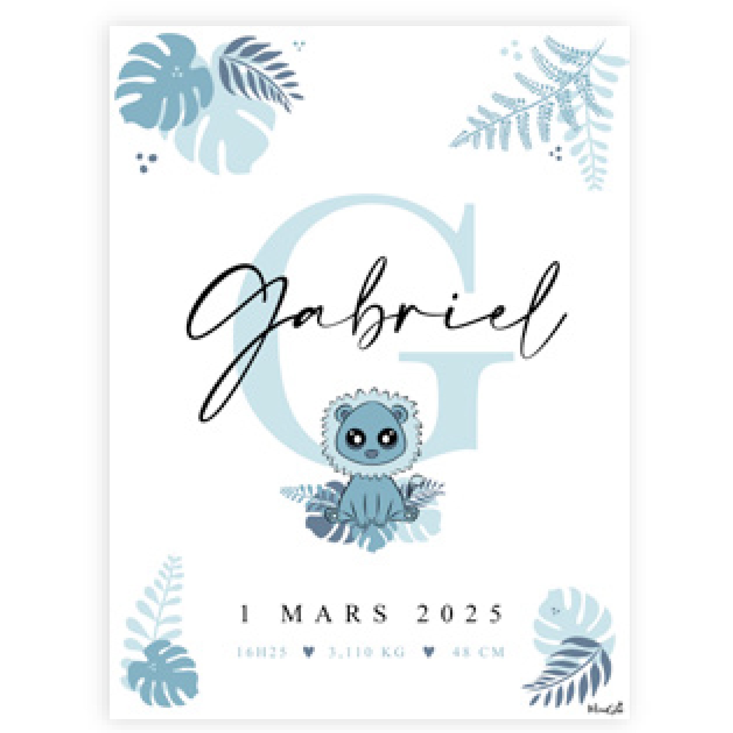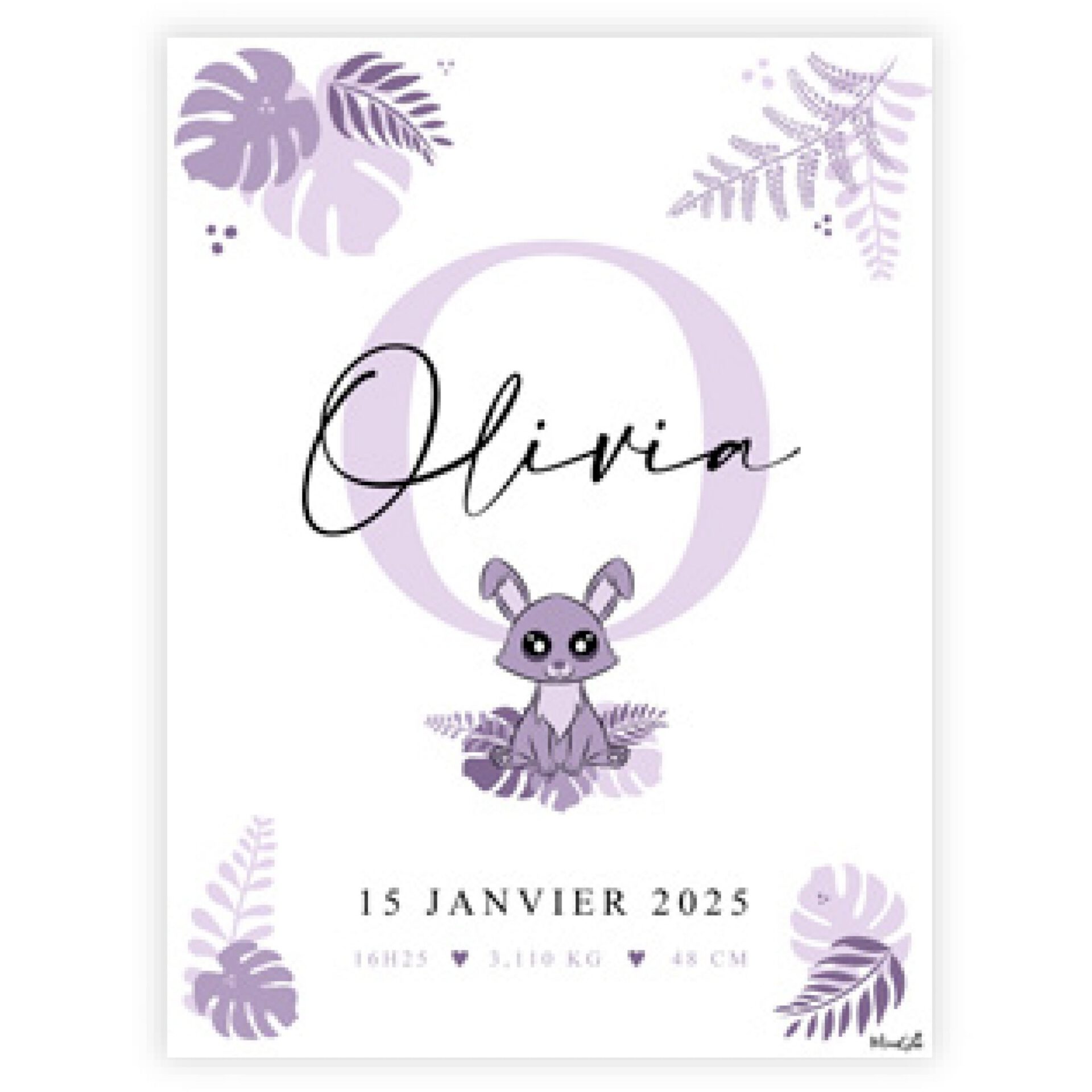 L’affiche bébé animal vous propose de combiner un petit animal trop mignon, avec le prénom et l’initiale de bébé, ainsi que ses informations de naissance (date, heure, poids et taille).