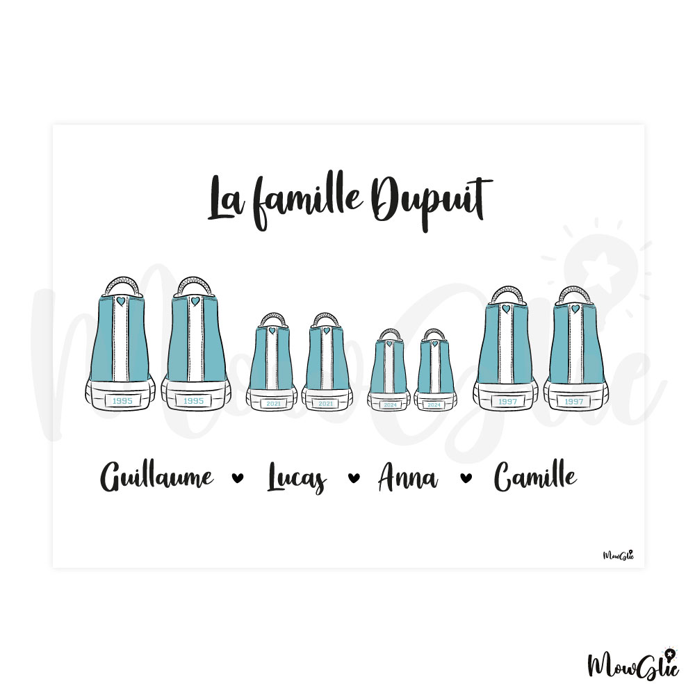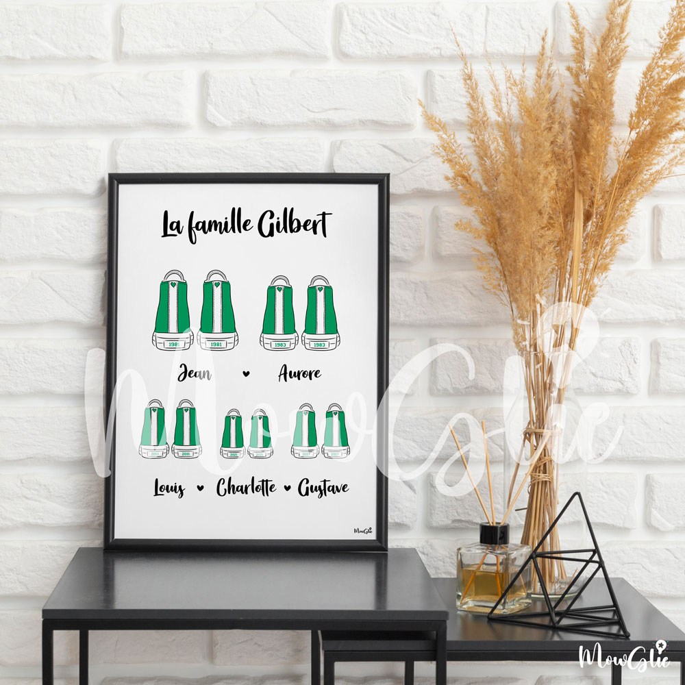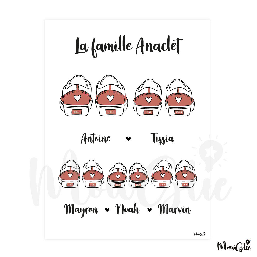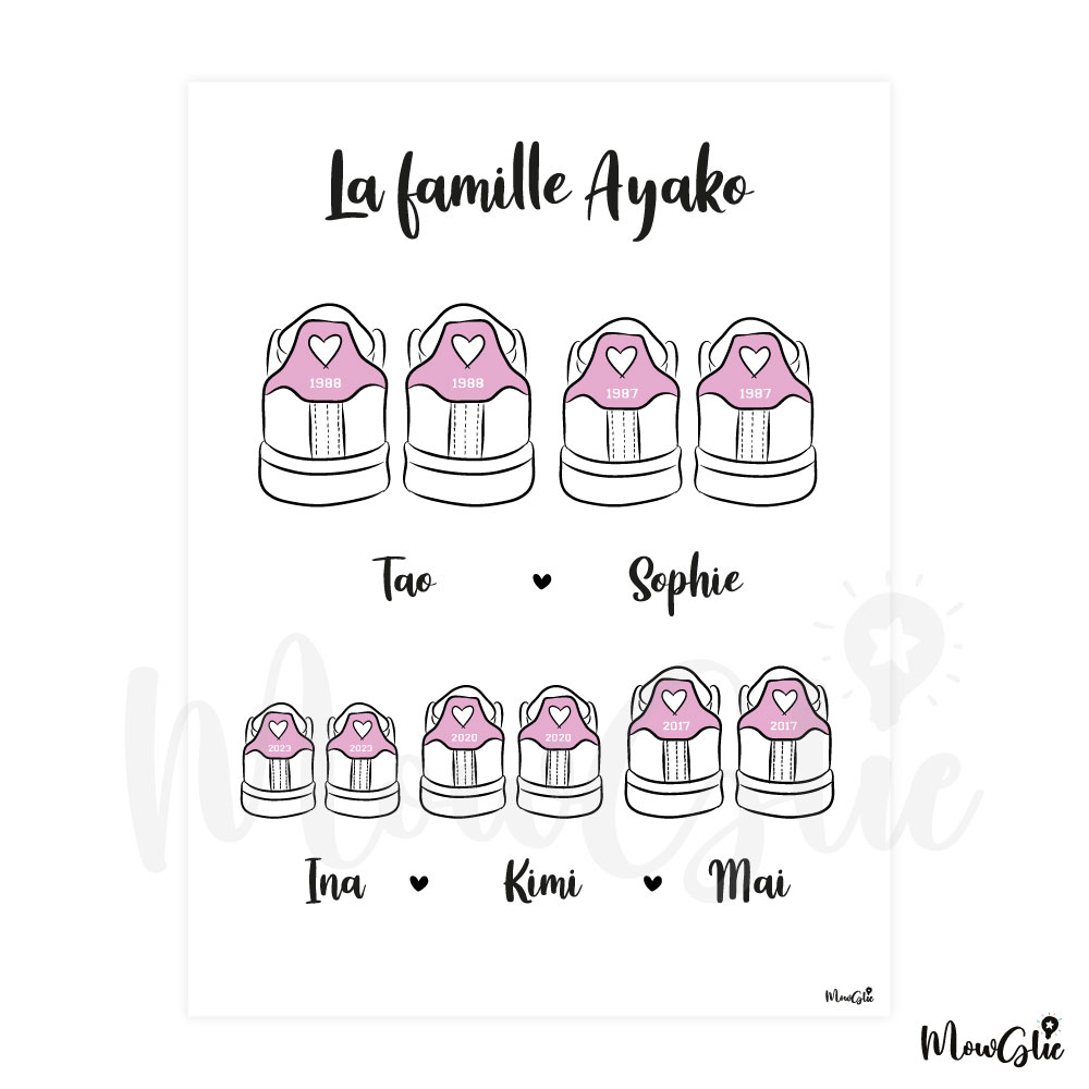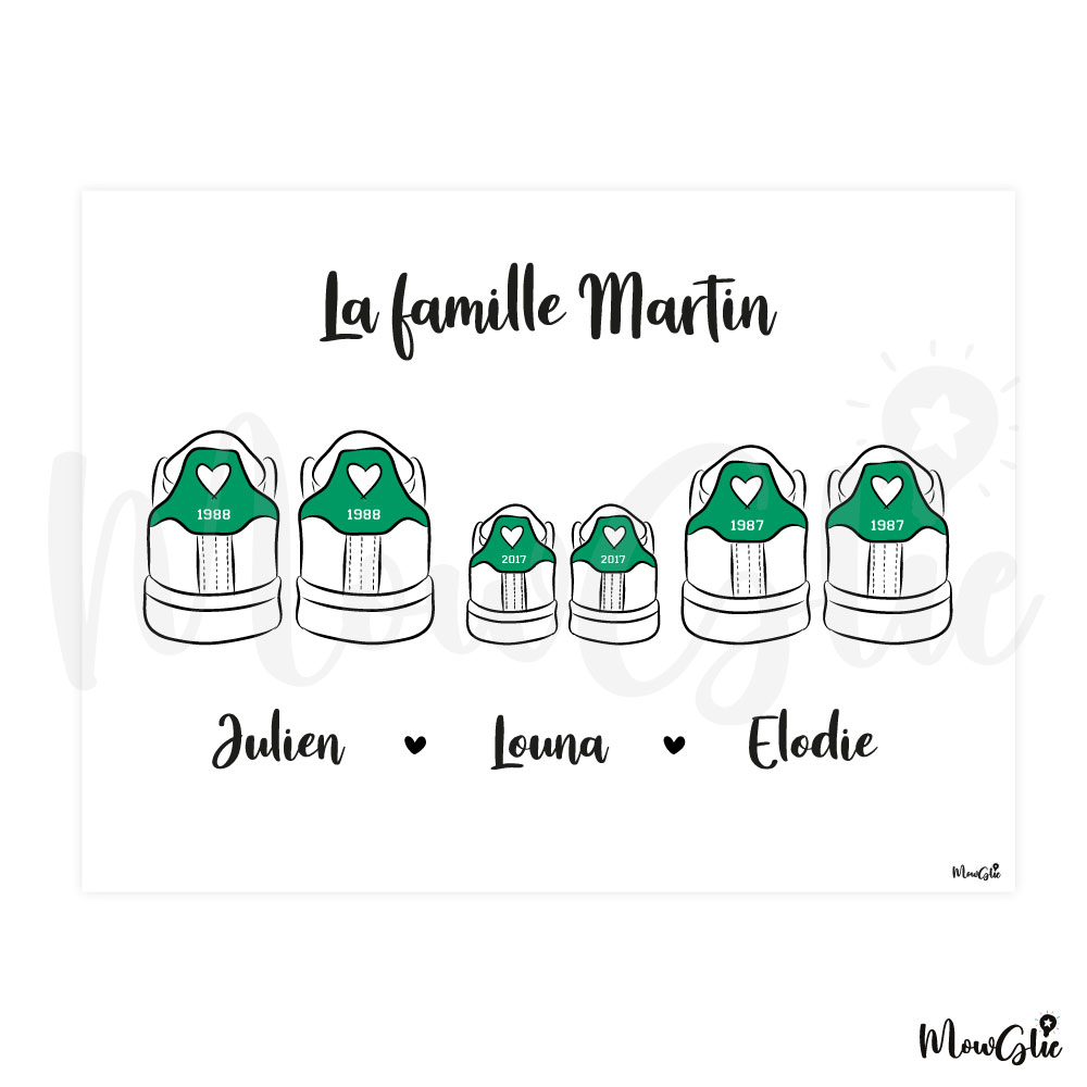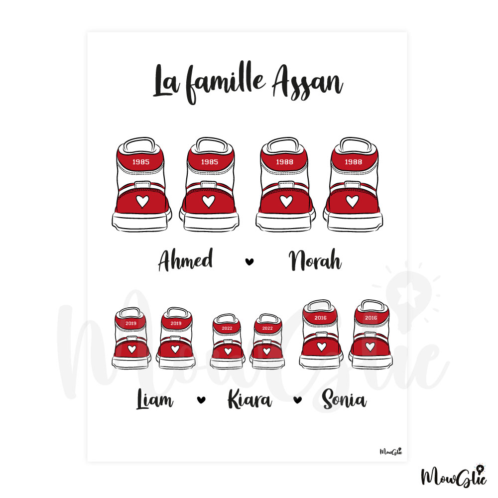 Immortalisez les liens qui unissent votre famille ou celle d’un proche avec l’affiche Sneakers Family et offrez une création unique, un cadeau plein d’émotion et un souvenir précieux. Choisissez un modèle de basket et personnalisez l’affiche avec les prénoms et dates de naissance de chacun des membres de la famille.