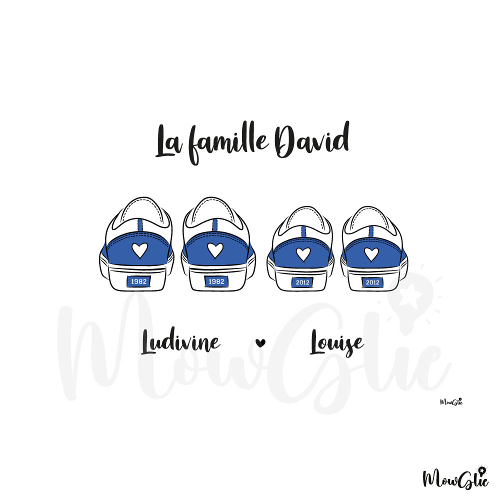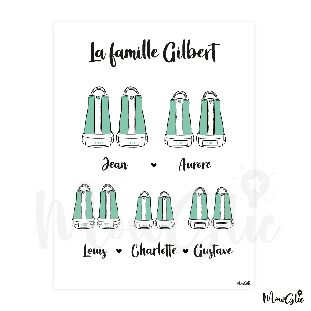 L’affiche Sneakers Family est le cadeau personnalisé idéal à offrir à une famille pour lui rappeler chaque jour les liens précieux qui l’unissent. Une attention originale remplie d’amour et d’émotion. Choisissez un modèle de basket et personnalisez-la avec les prénoms et dates de naissance de chacun des membres de la famille. Vous avez le choix parmi 4 modèles de baskets - Stan Smith, Vans, Jordan et Converse - et 8 couleurs - rose, terracotta, rouge, noir, vert menthe, vert forêt, bleu ciel et bleu roi. L’affiche est au format horizontal jusque’ à 4 paires de baskets et passe ensuite au format vertical à partir de 5 membres de la famille.