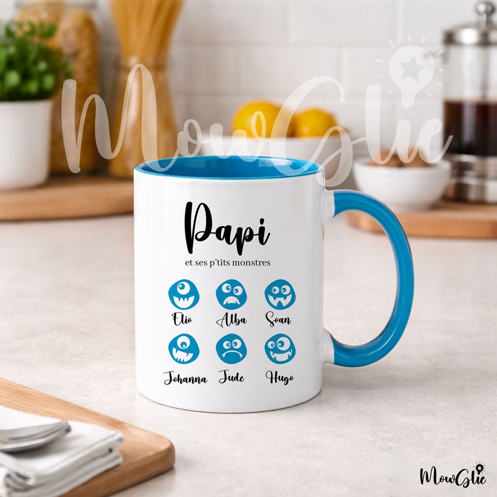 Le mug P’tits Monstres est le cadeau personnalisé parfait à offrir à un papa, un papi, tonton, parrain… exceptionnel. Plus qu’une tasse, c’est un hommage tendre à tous les moments précieux passés avec ses enfant. petits-enfants, filleul(e)s, neveux, nièces… une attention pleine d’amour qui lui donnera le sourire à chaque gorgée.
