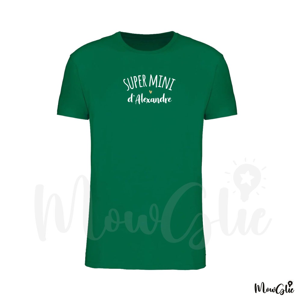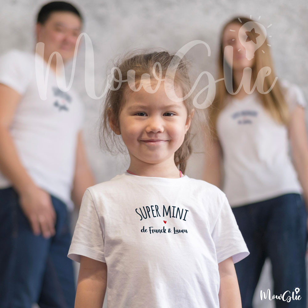 Le tee-shirt enfant Super Mini est une idée de cadeau personnalisé pleine d’émotion à offrir à un enfant pour une occasion particulière ou simplement pour lui faire plaisir. Combinez-le aux tee-shirts Super Papa et/ou Super Maman pour un look matchy-matchy en famille qui fera sensation lors d’un repas de famille ou une séance photo. Il restera ainsi un précieux souvenir. Disponible également en version bébé pour les plus petits.