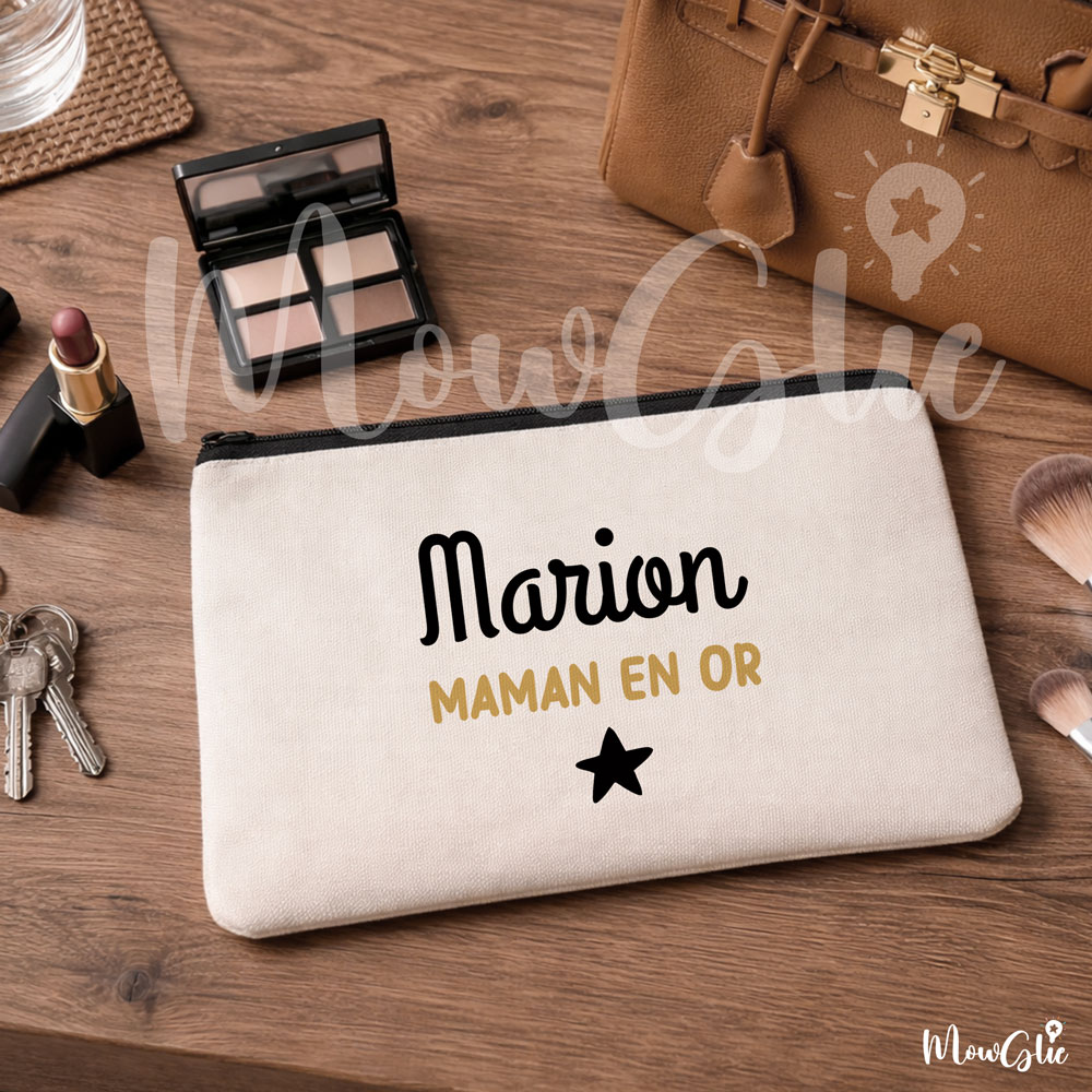 La trousse fourre-tout Amour en Or est le cadeau personnalisé idéal à offrir à un proche pour lui rappeler chaque jour à quel point il ou elle est une personne exceptionnelle à vos yeux. Bien plus qu’un accessoire, c’est un message d’amour, une attention pleine de tendresse..Compacte et résistante, elle permet de garder à portée de main tous ses indispensables du quotidien : maquillage, petits accessoires ou essentiels de la journée. Faites-en une pièce unique en la personnalisant avec son prénom, son titre et en choisissant entre 2 versions :